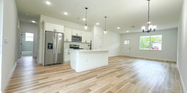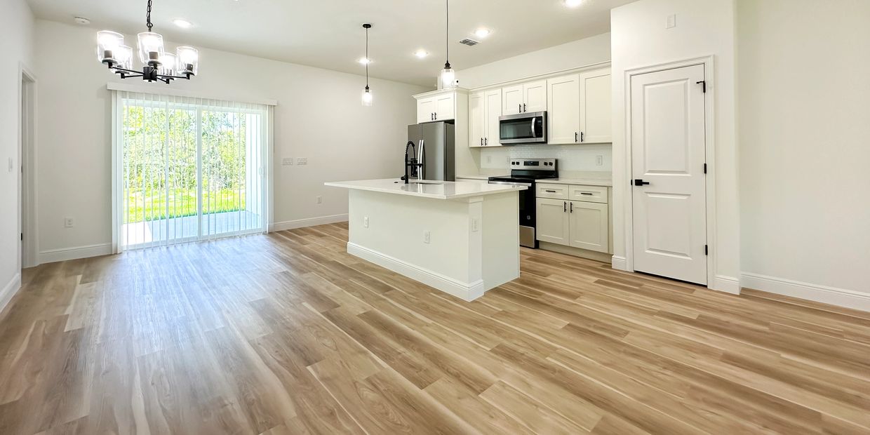 The spacious living area flows into a gourmet kitchen with gorgeous wood-like vinyl flooring throughout.