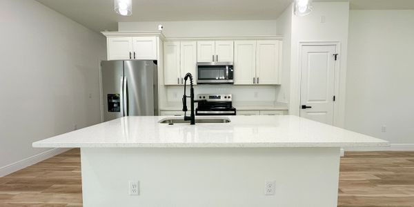 White wood cabinetry, kitchen island, upgraded quartz countertops, matte black chandelier and fixtures, and a pantry.