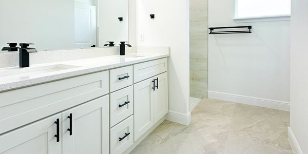 floor-to-ceiling tiled showers, matte black fixtures, and wood-look vinyl flooring throughout.